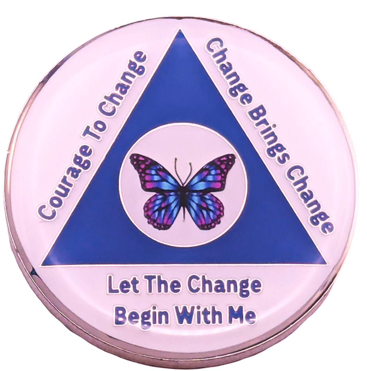 On One Side: A blue and purple butterfly within the Al-Anon Symbol. The 3-sides of the triangle are embossed with "Courage to Change", "Change Brings Change", "Let The Change Begin With Me".